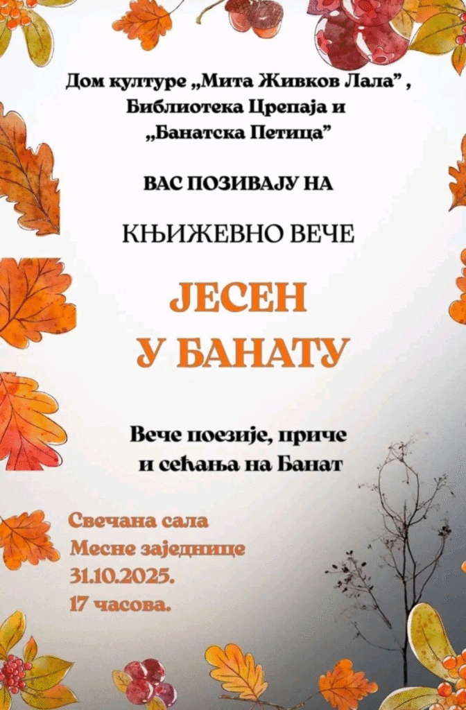 U organizaciji Doma kulture ,,Mita Živkov Lala”, ,,Banatske Petice” i Opštinske biblioteke, ogranka u Crepaji, 31. oktobra, biće održano književno veče pod nazivom ,,Jesen u Banatu”. Ovaj kulturni događaj biće održan u svečanoj sali Mesne zajednice u Crepaji sa početkom u 17 sati i biće posvećen poeziji, pričama i sećanjima na Banat, večitoj inspiraciji književnika i pesnika iz naših krajeva.